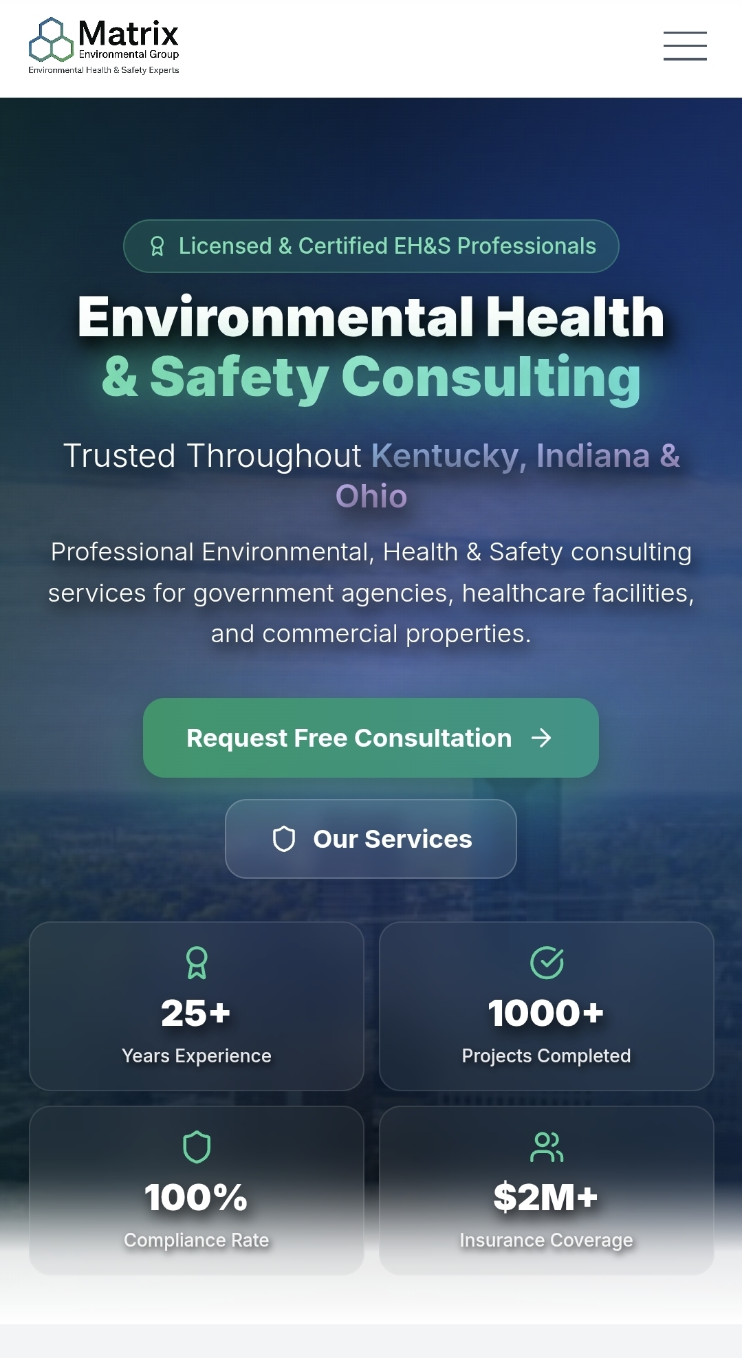 Environmental consulting meets AI. Built with an integrated chatbot, trust-building stat cards, and CTAs that drive consultations.